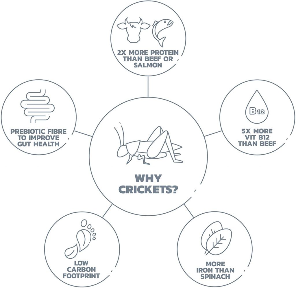 Crickets are a good source of protein, fat, vitamins, minerals, and fiber and may benefit gut health. Plus, they're a more environmentally friendly protein option than other animal-based proteins, such as chicken or beef.
